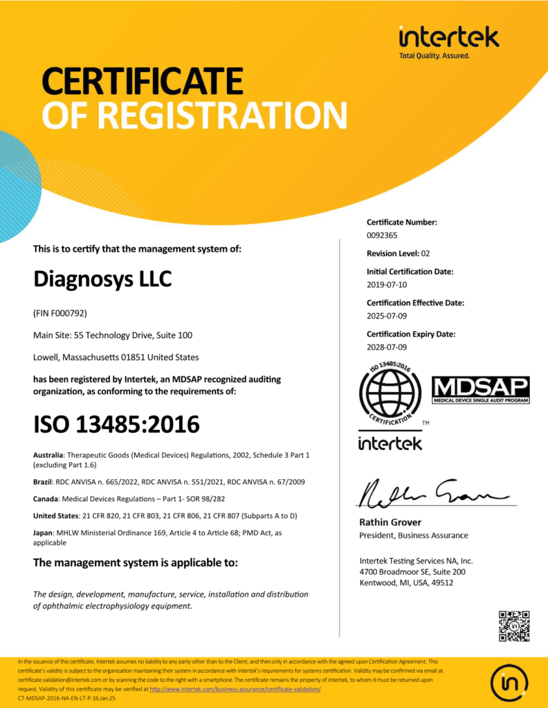 Diagnosys LLC is an ISO 13485:2016 / MDSAP certified corporation with FDA-registered medical device establishment. Diagnosys’ systems are CE marked and FDA 510(k) cleared and also has products installed worldwide with country specific medical device approvals where required. All Diagnosys systems are RoHS compliant as well as ETL marked.