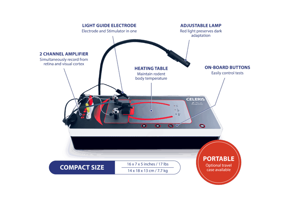 From rodents to rabbits, Celeris delivers a superior preclinical visual electrophysiology experience. Its patented Light Guide electrode-stimulator simultaneously delivers light stimuli and records neural activity. This breakthrough design enables high-throughput ERG and VEP testing with ease and simplicity.