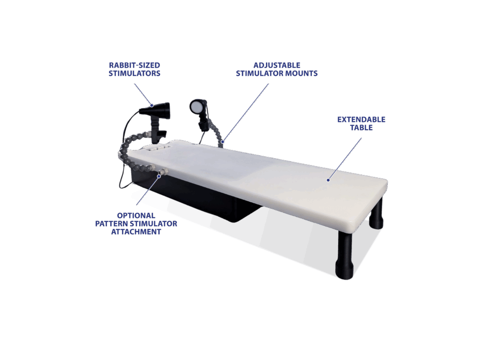 Rabbit visual electrophysiology is fully supported on the Celeris platform with the addition of the Rabbit Kit, an extension table and specialty-sized stimulators designed for larger animals. Because most rabbits can’t fit on a standard Celeris system, the kit includes an extendable table that supports the full body length and weight of the animal, ensuring stability during testing.