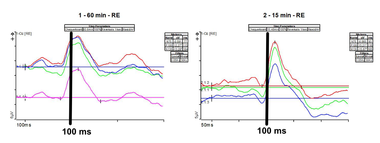 Notice the well-defined P100 peak at about 100 ms, indicating a typical normal response.